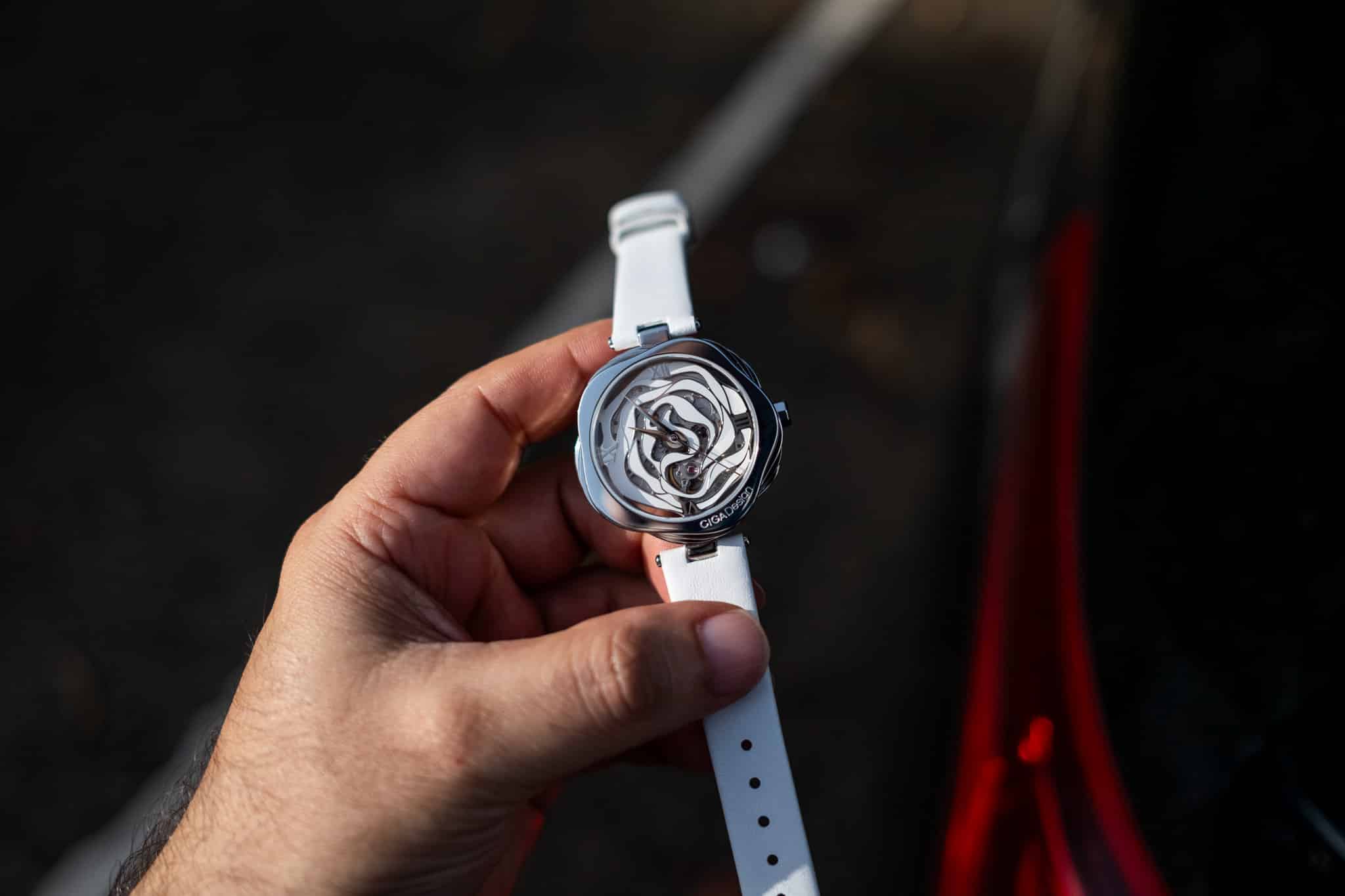 The watch’s asymmetrical rose-shaped steel case immediately grabs attention. Unlike conventional round or square watches, this CIGA Design R Series watch embodies the beauty of a blooming rose, making it an expression of individuality and style. The see-through case back invites admiration of the precise automatic movement a delight for watch enthusiasts.
